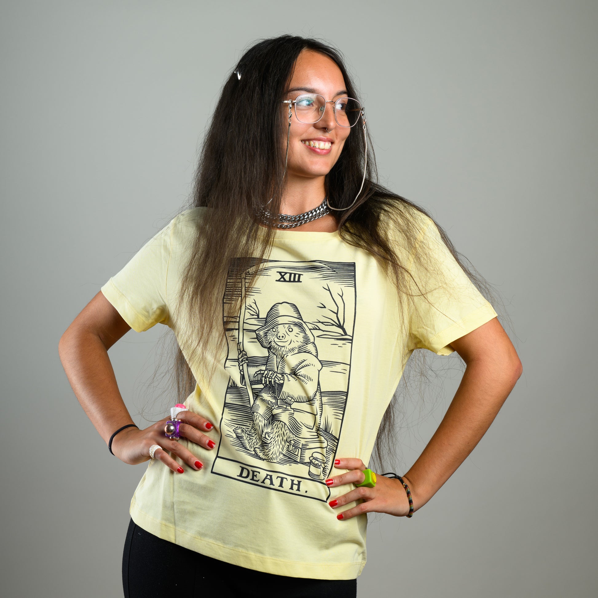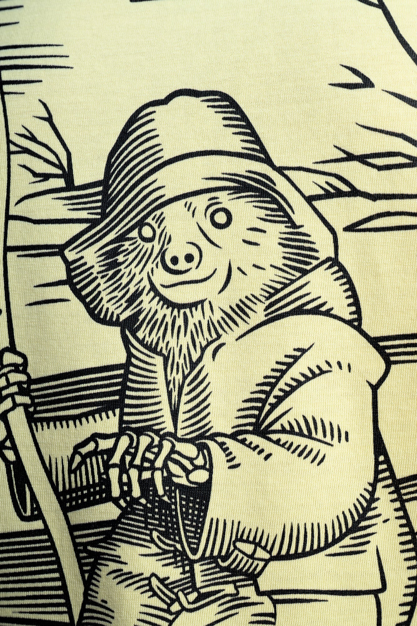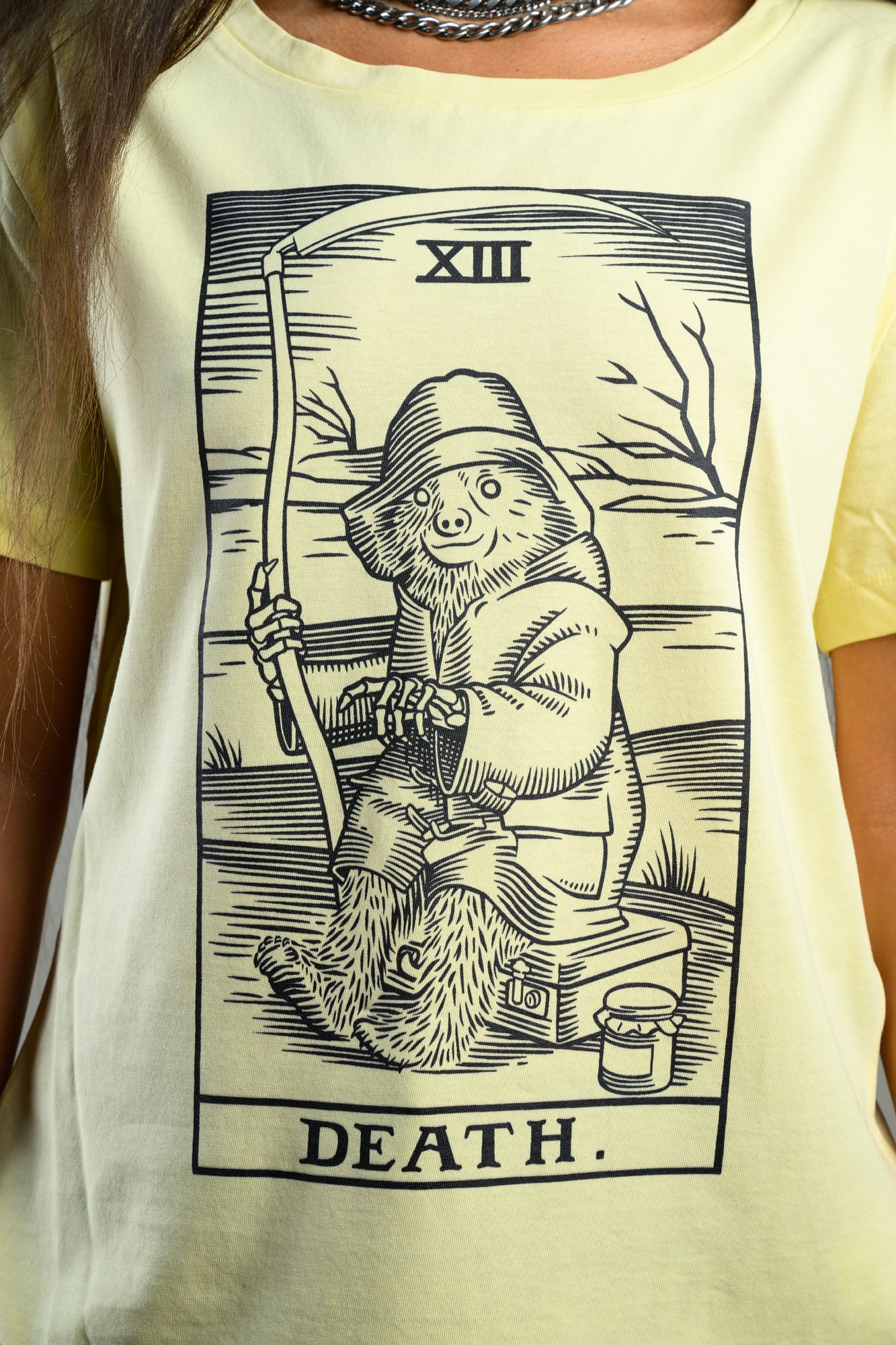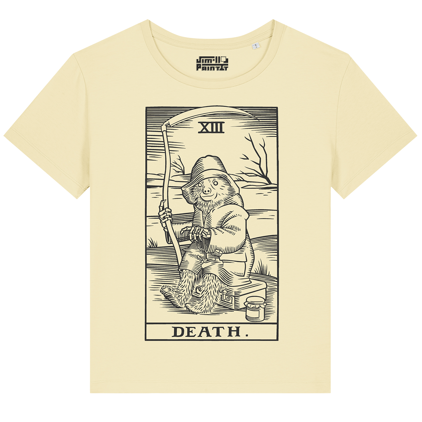 Black front print on butter-yellow scoop neck T-shirt