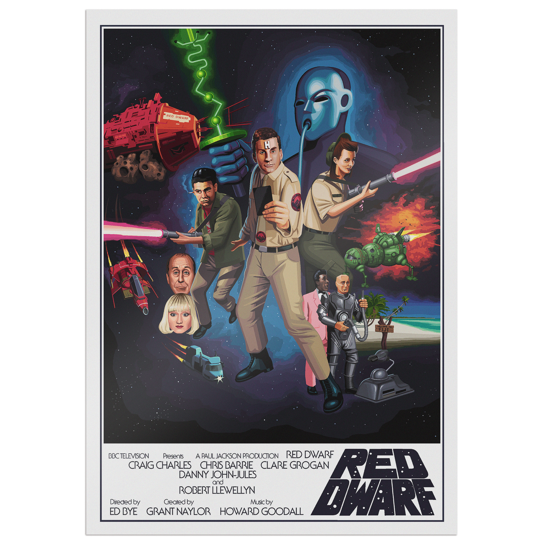 A gloss finish poster print featuring the classic British space-com Red Dwarf in the style of the original Star Wars poster