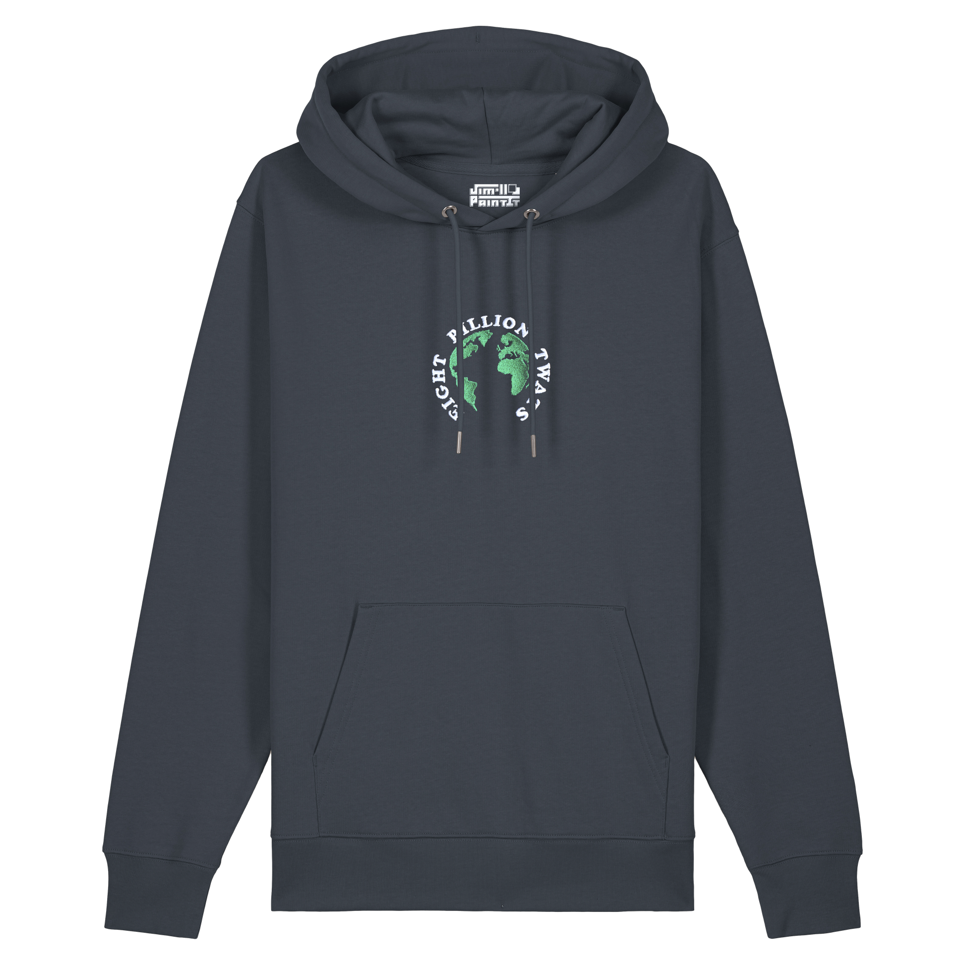 Two colour embroidery on india ink grey heavy weight hooded sweatshirt