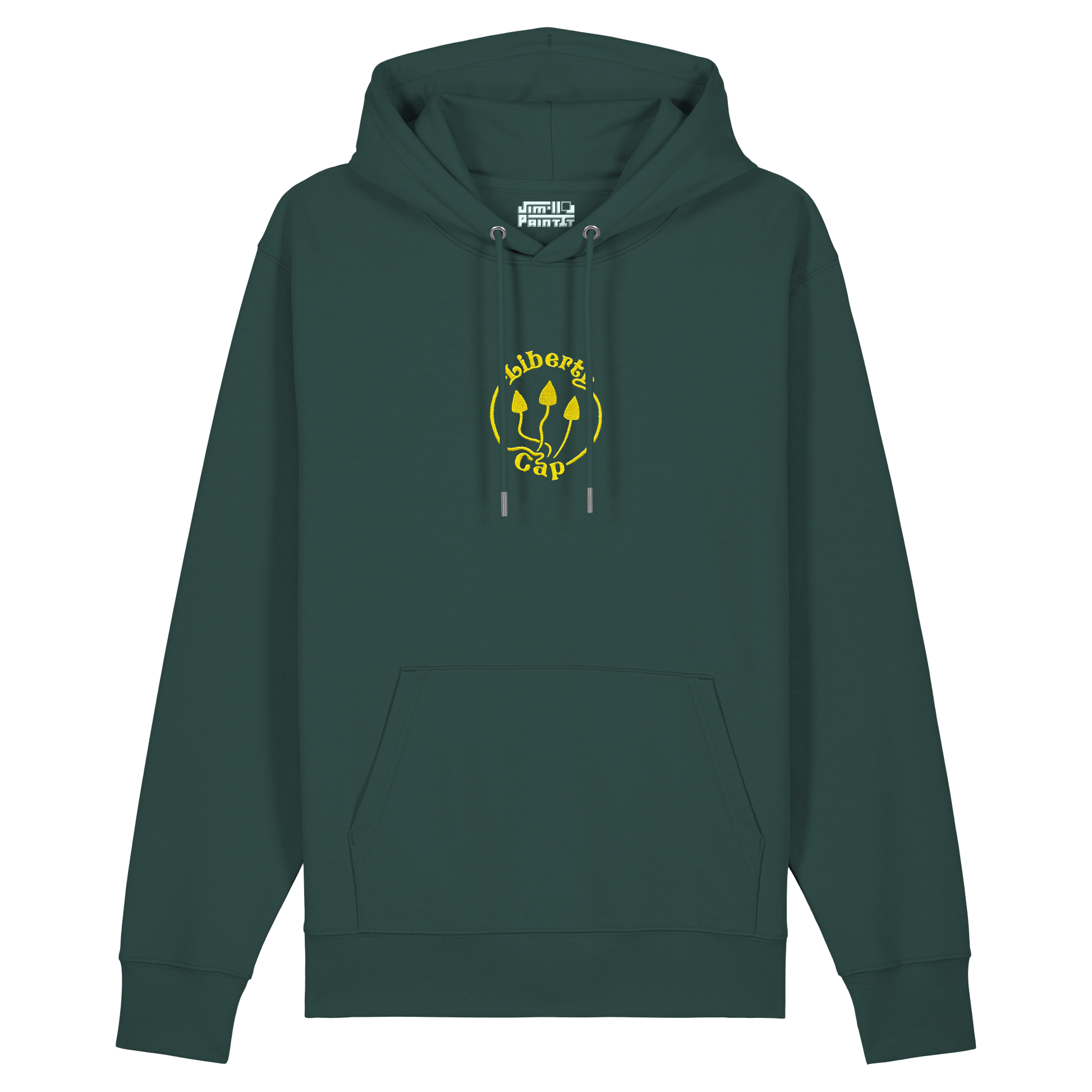 Yellow embroidery on glazed green heavy weight hooded sweatshirt
