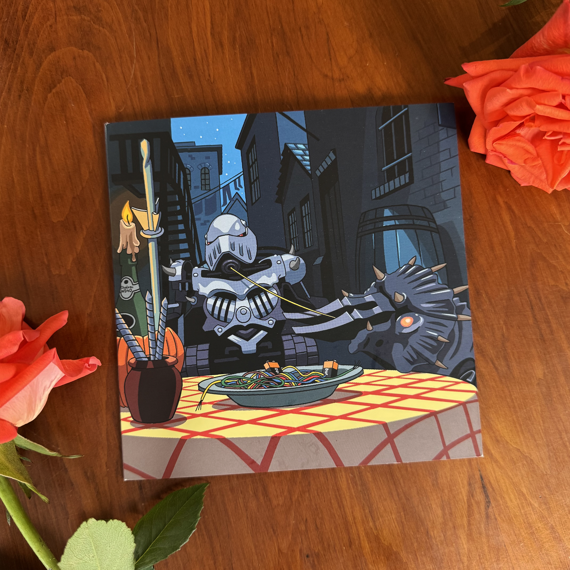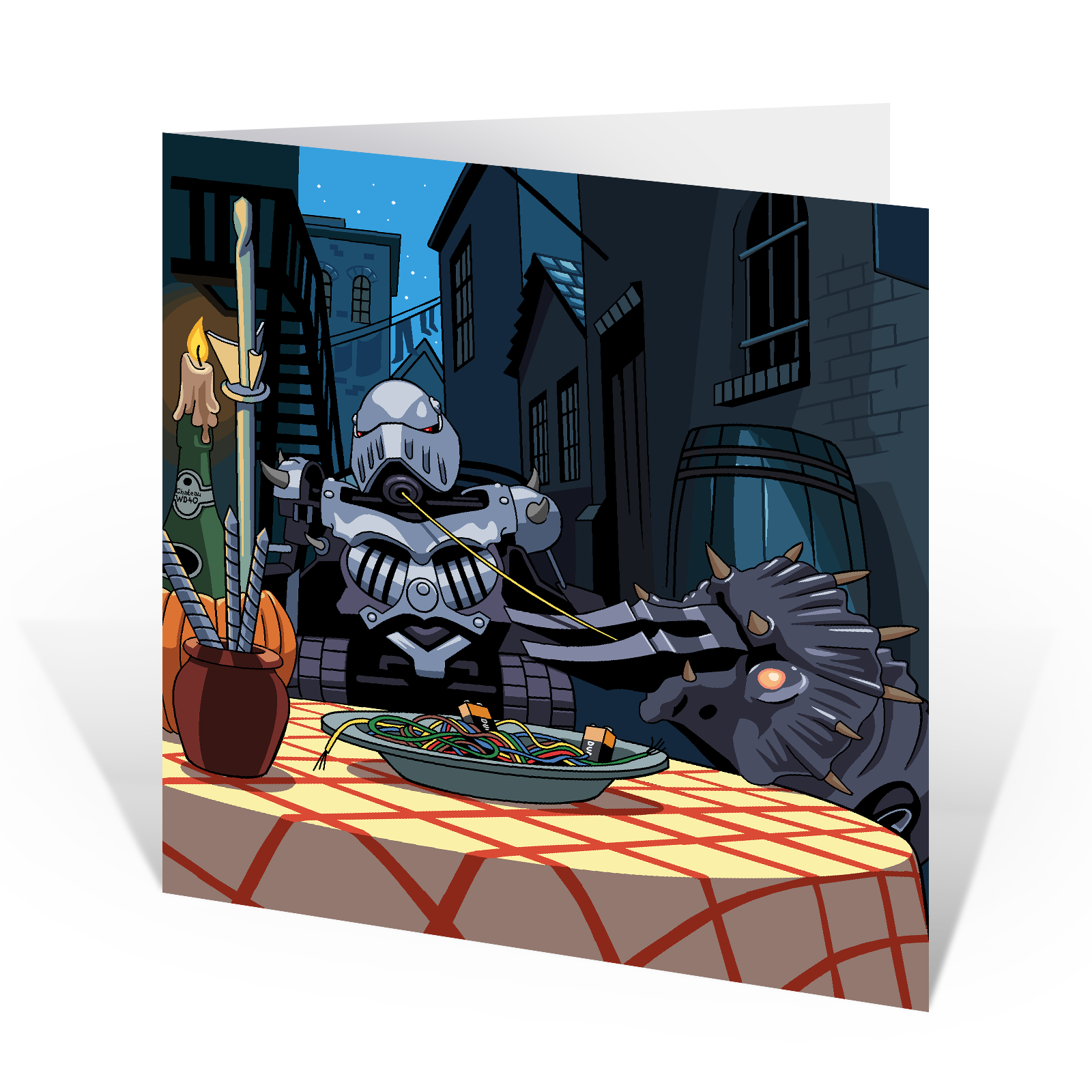 A romantic scene featuring Sir Killalot and Matilda having a romantic candle lit dinner of batteries and wires