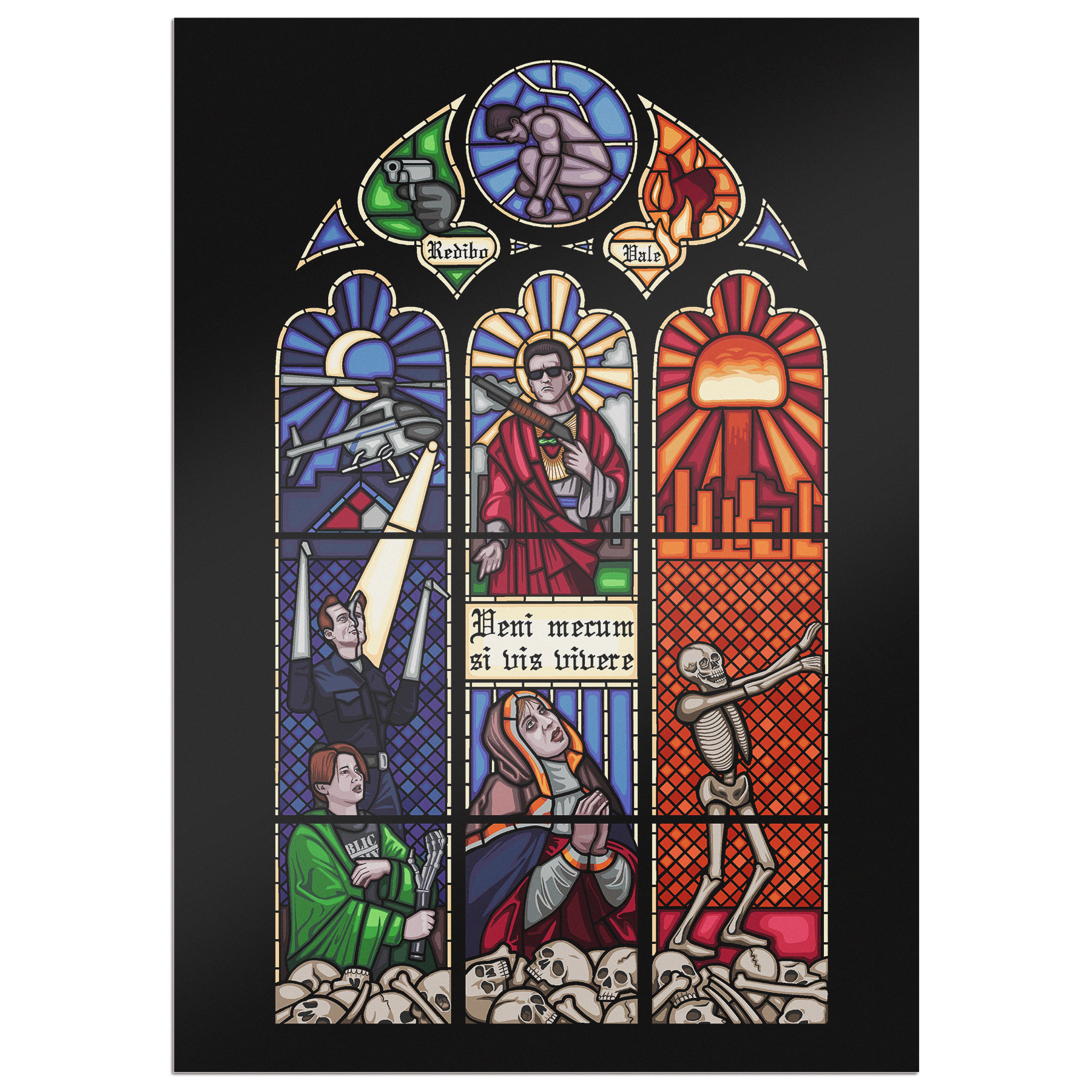 A gloss finish poster print featuring "Terminator 2 in the style of ecclesiastical stained glass"
