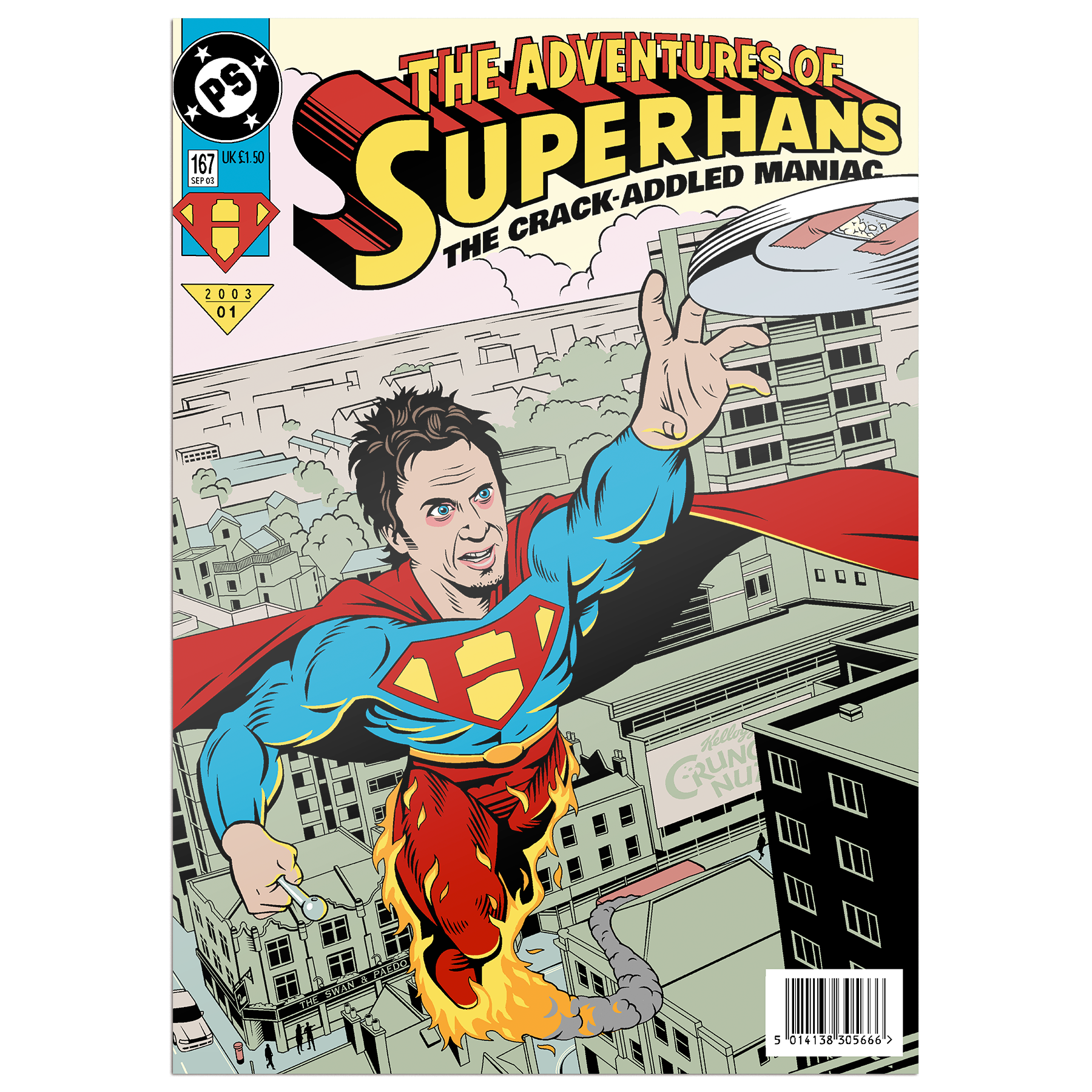 Gloss poster print reproduction of the front cover artwork from issue 1 of The Adventures of Super Hans the Crack-addled Maniac